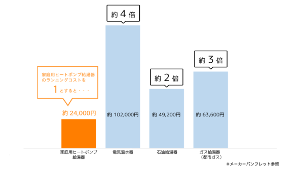 ランニングコストは、燃料が必要なガス給湯器よりも、断然お得!