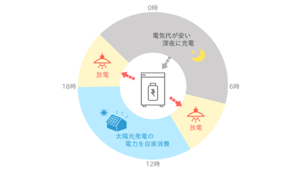 蓄電池には割安な夜間電力を買って貯めることも可能です。夜間、蓄電池に貯めておいた割安な電気を、電力消費のピーク時に使用することで電気代の削減効果が期待できます。