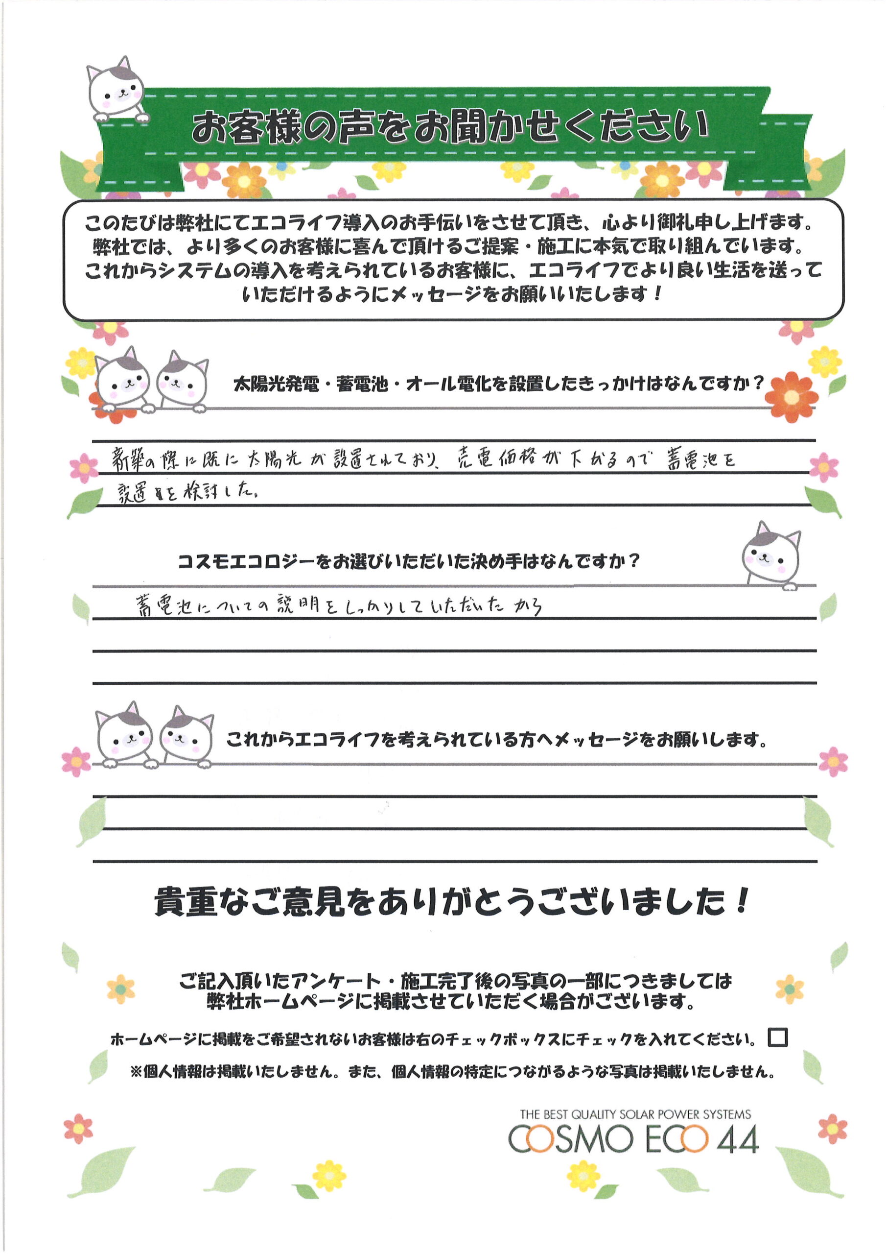 新築の際に既に太陽光が設置されており、売電価格が下がるので蓄電を設置を検討した。