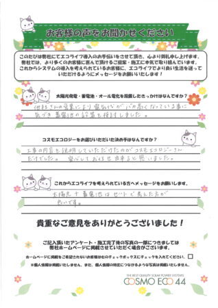 工事内容を説明していただけたのがコスモエコロジーさんだけでした。安心してお任せできると思いました。