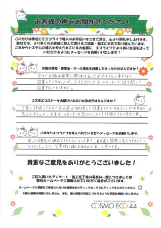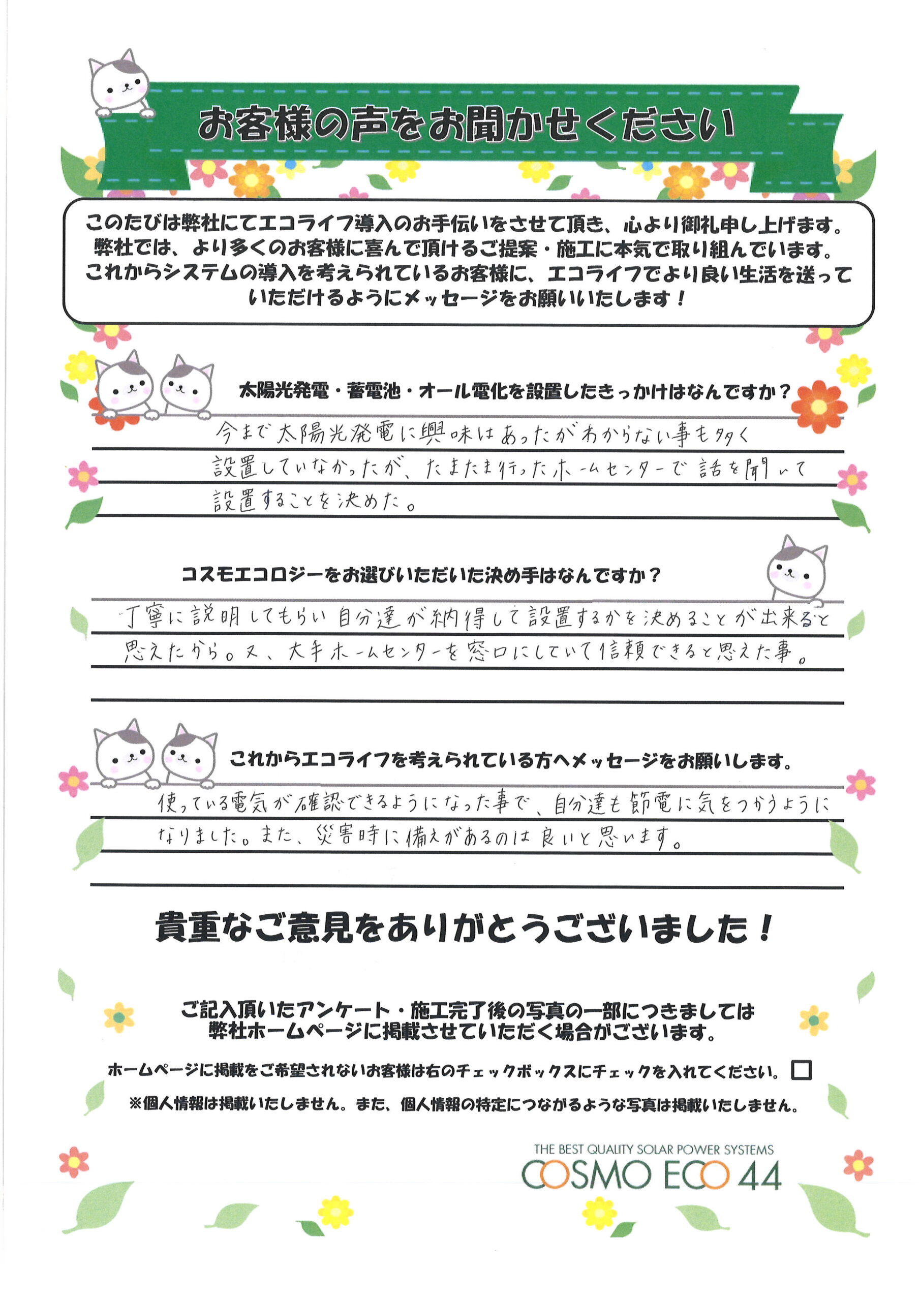 使っている電気が確認できるようになった事で、自分達も節電に気をつかうようになりました。また、災害時に備えがあるのは良いと思います。