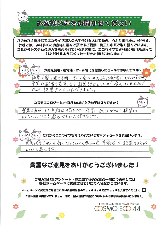 新築で家を建てる時にオール電化の太陽光発電にしたのですが、予算の都合で蓄電池を設置できなかったので今回コスモエコロジーさんで設置させていただきました。