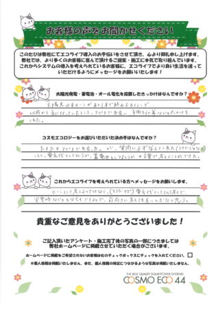 たまたまアピタで出会った。が、質問に必ず答えてくれた(テキトーじゃなく)ことと、電気代として払うか、蓄電池として払うかの言葉で考えることができた。