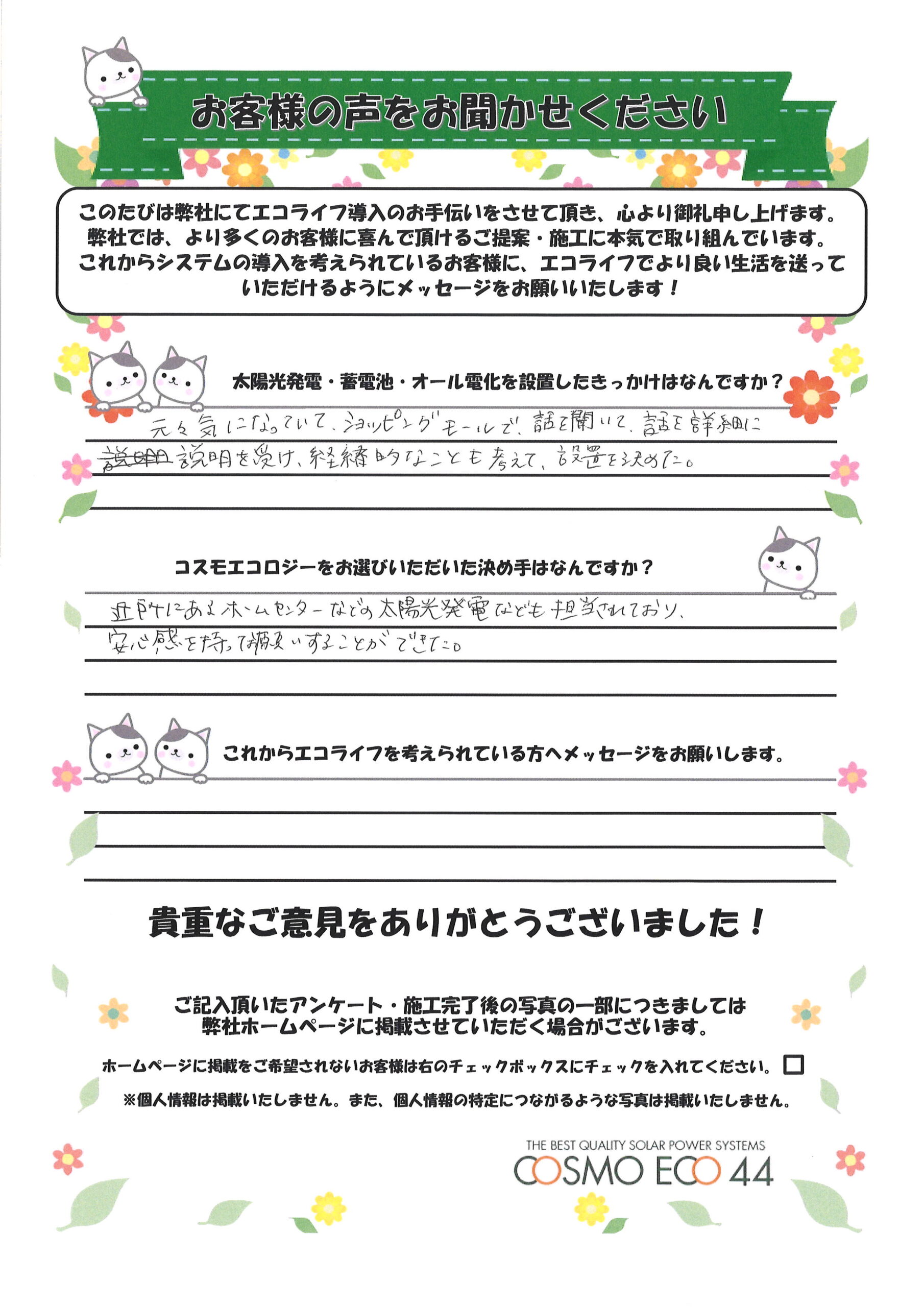 近所にあるホームセンターなどの太陽光発電なども担当されており、安心感をもってお願いすることができた。