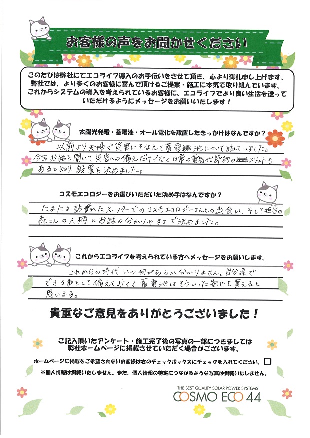 以前より夫婦で災害に備えて蓄電池について話していました。今回お話を聞いて災害への備えだけでなく日常の電気代節約のメリットもあると知り、設置を決めました。