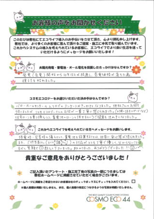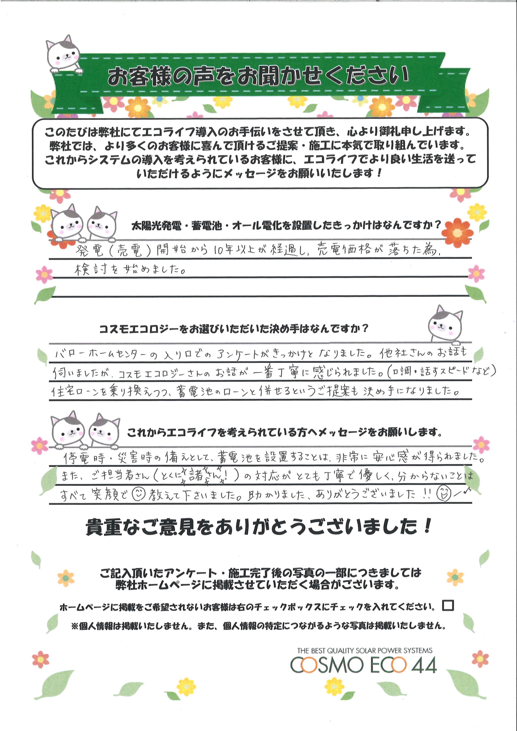 バローホームセンターの入り口でのアンケートがきっかけとなりました。他社さんのお話も伺いましたが、コスモエコロジーさんのお話が一番丁寧に感じられました。(口調・話すスピードなど)住宅ローンを乗り換えつつ、蓄電池のローンを併せるというご提案も決め手になりました。