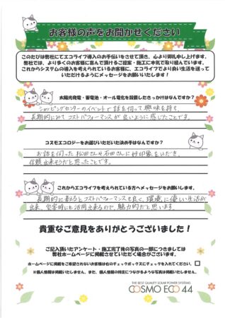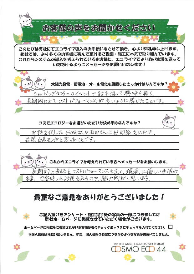長期的に考えるとコストパフォーマンスも良く、環境に優しい生活が出来、災害時にも活用できるので、魅力的だと思います。