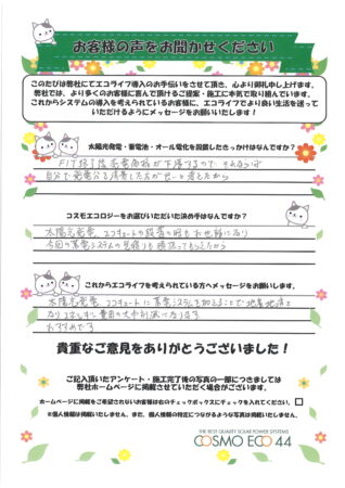 太陽光発電、エコキュートの設置の時もお世話になり、今回の蓄電システムの見積りも頑張ってもらえたから。