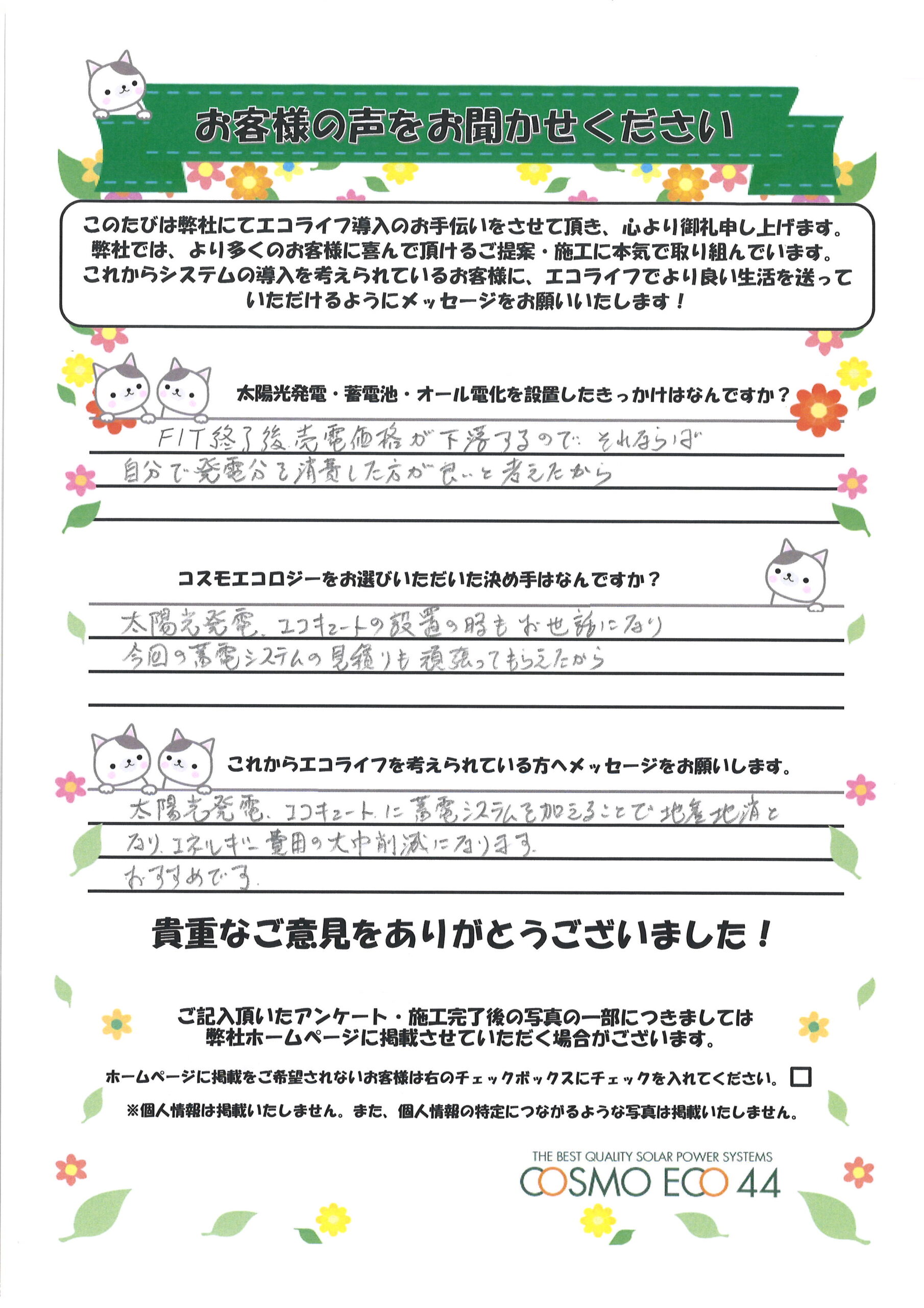 FIT終了後、売電価格が下落するので、それならば自分で発電分を消費した方が良いと考えたから。