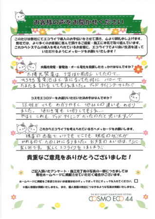 太陽光発電は7年ほど前からしてたので、そろそろ蓄電池はと、気になってた時に、バローでたまたま話をしてもらえました。グッドタイミングでした!!