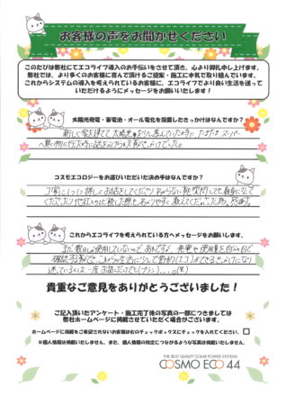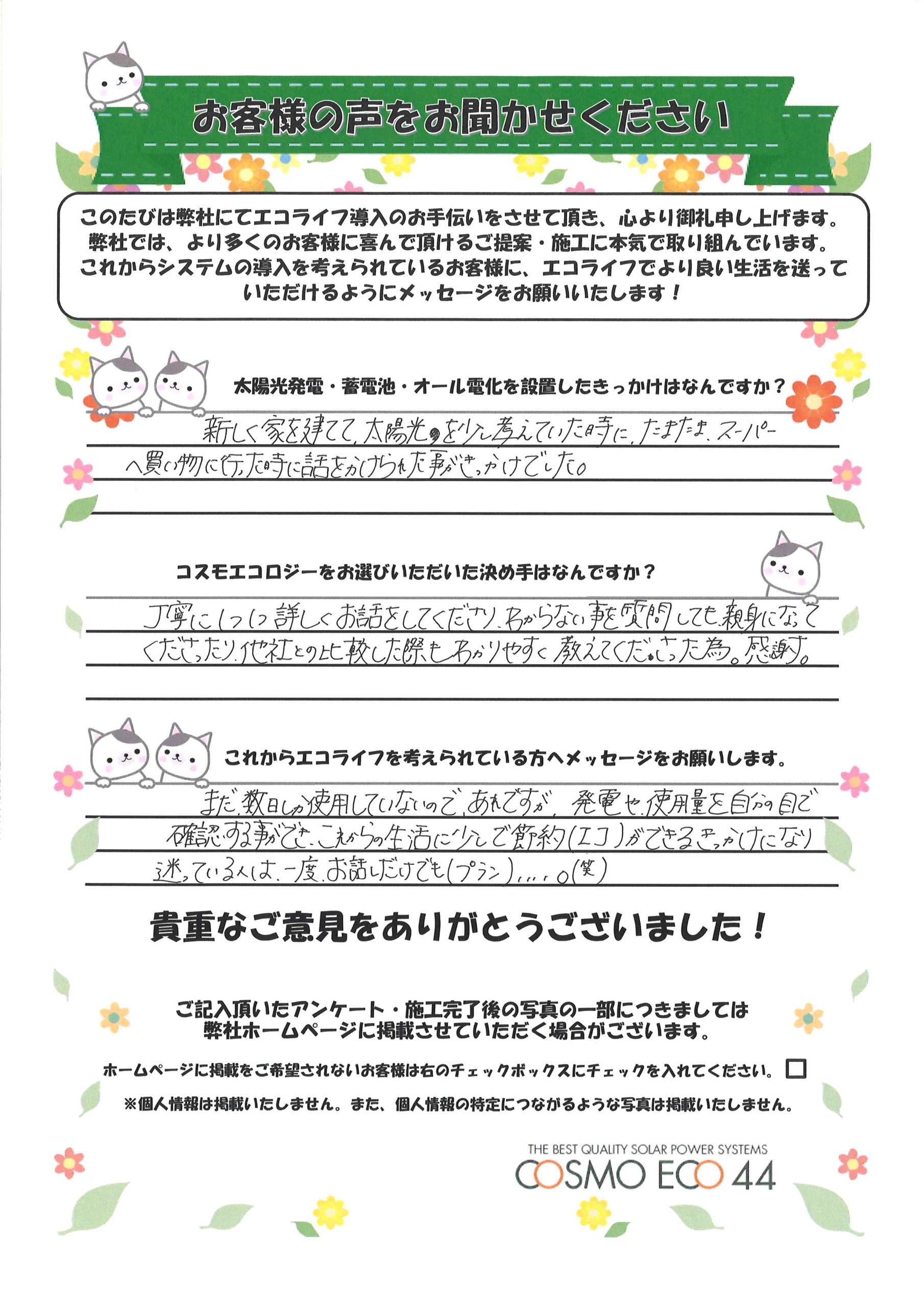 新しく家を建てて、太陽光を少し考えていた時に、たまたまスーパーへ買い物に行った時に話しかけられた事がきっかけでした。