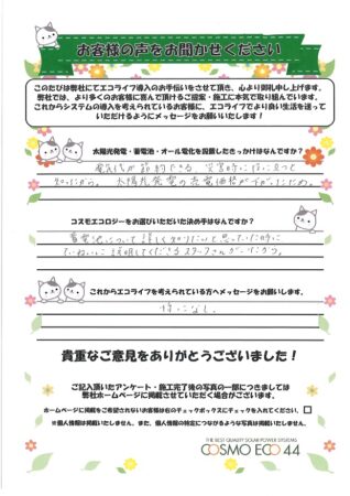 電気代が節約できる、災害時に役に立つと知ったから。太陽光発電の売電価格が下がったため。