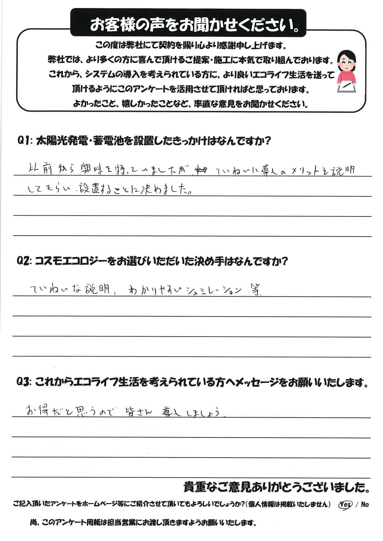 以前から興味を持っていましたが、ていないに導入のメリットを説明してもらい、設置することに決めました。
