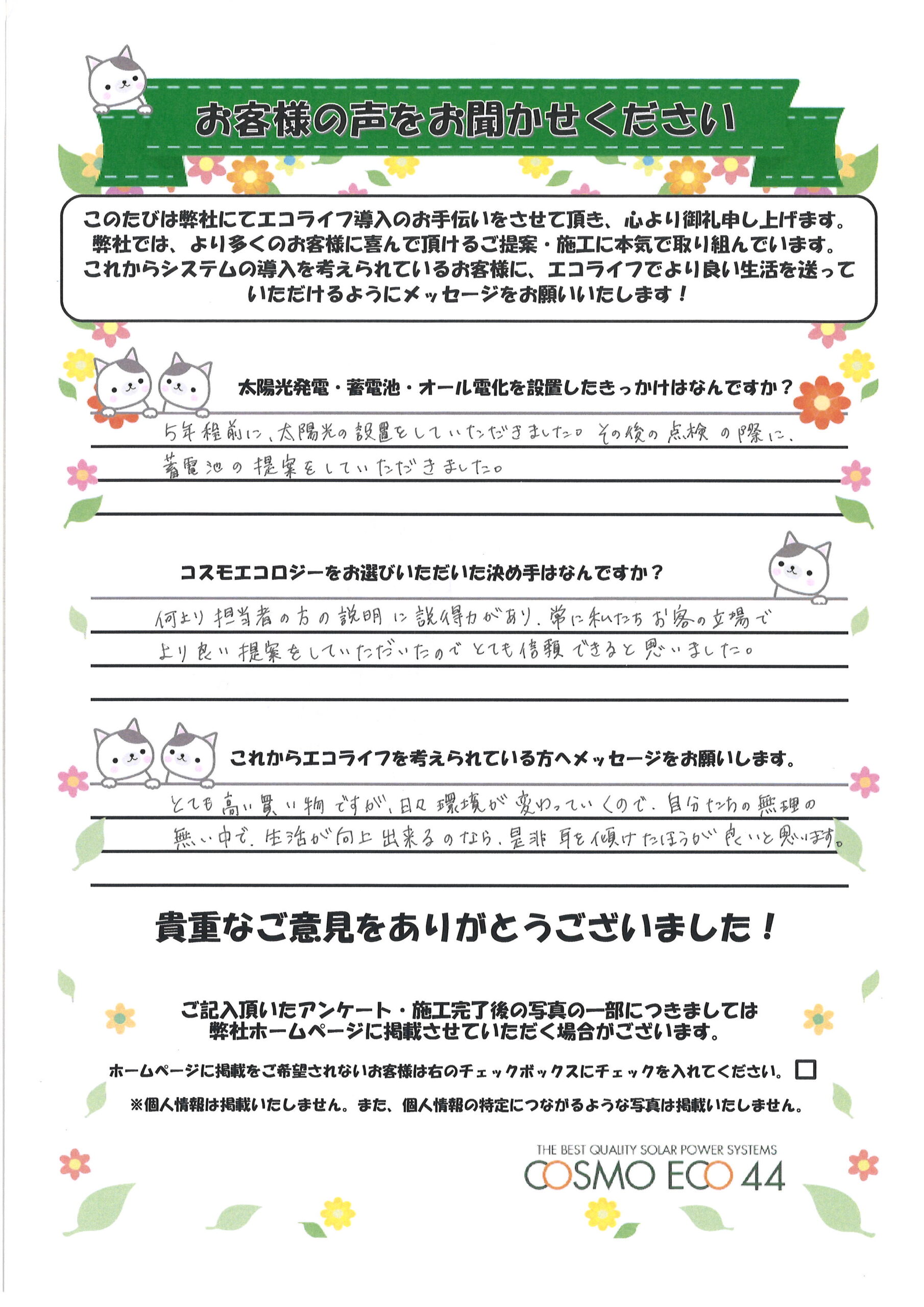 5年程前に、太陽光の設置をして頂きました。その後の点検の際に、蓄電池の提案をしていただきました。