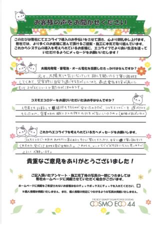 コスモエコロジーの方はわからない事があるとすぐに答えて下さったり、本当に丁寧に話しをしてくれるので、安心してまかせる事が出来ました。これからも、メンテなどでお世話になると思いますがよろしくお願いします。