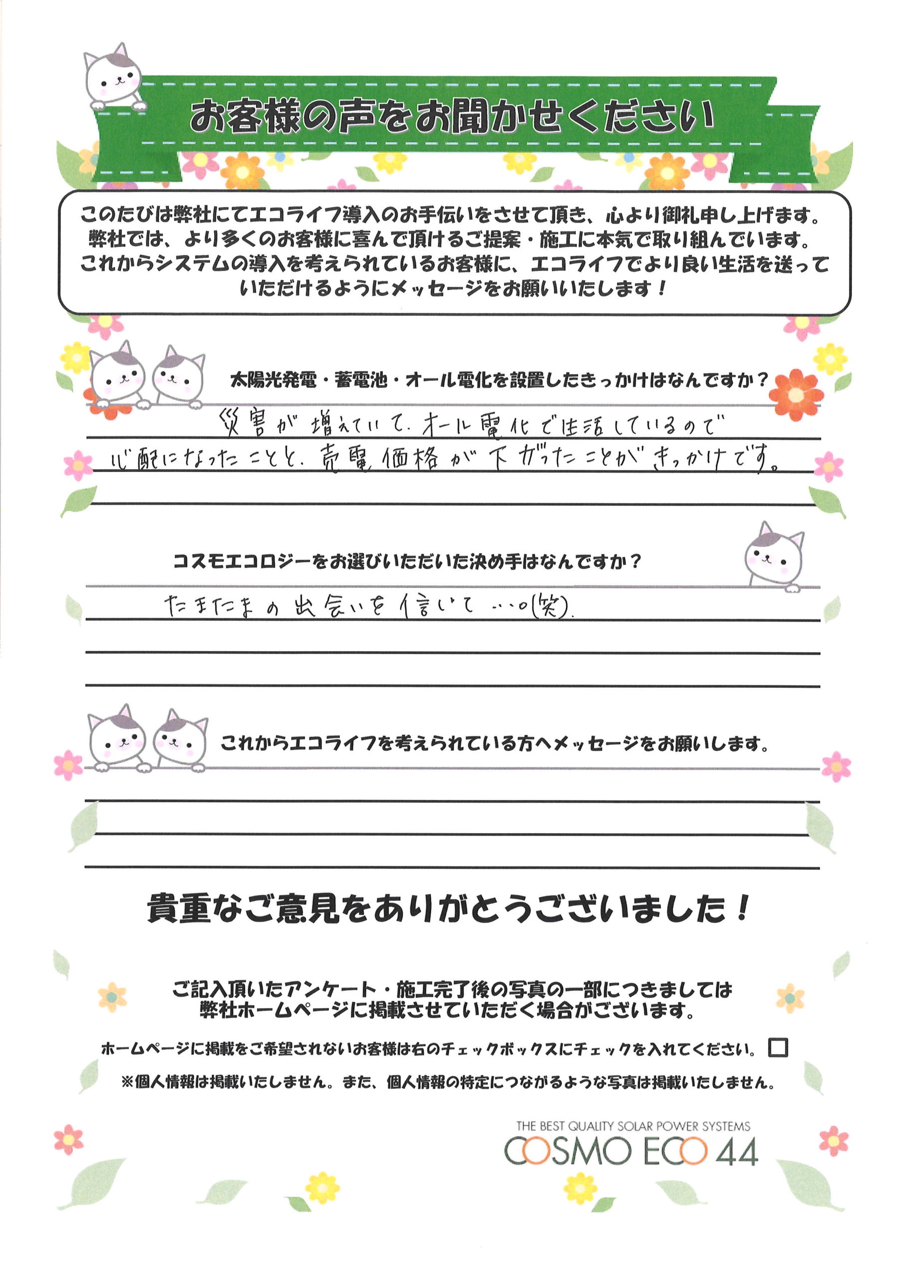 災害が増えていて、オール電化で生活しているので心配になったことと、売電価格が下がったことがきっかけです。
