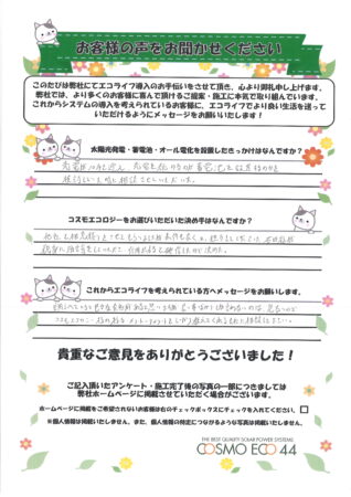売電が10年を迎え、売電を続けるのか蓄電池を設置するのかを検討していた時に相談させていただいた。