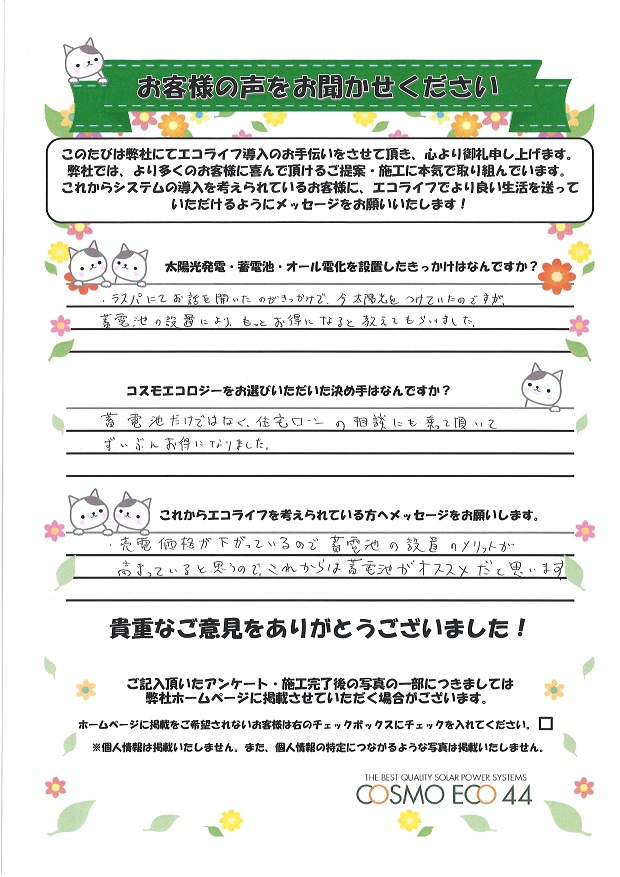 蓄電池だけではなく、住宅ローンの相談にも乗って頂いてずいぶんお得になりました。