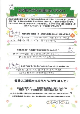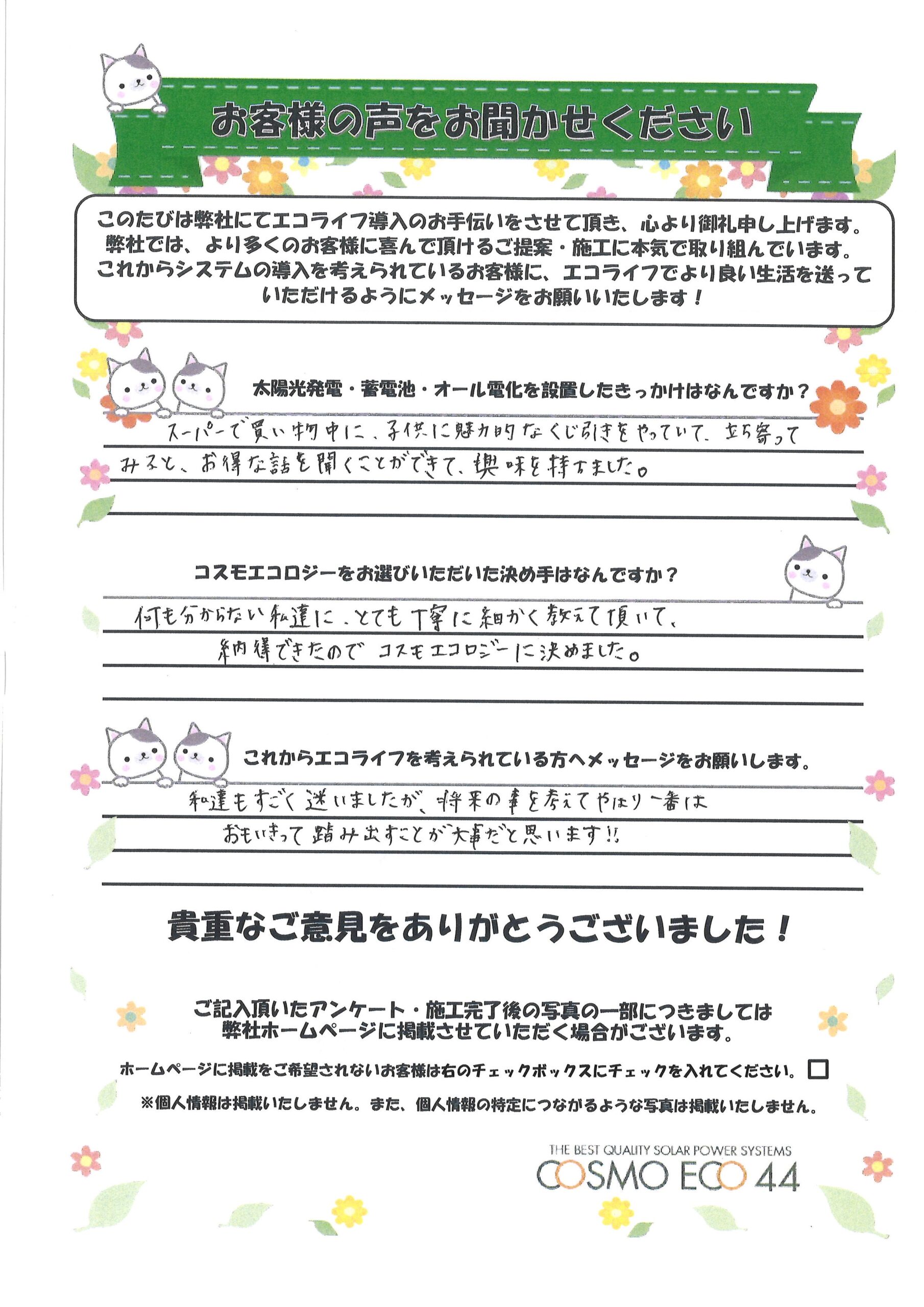 何もわからない私達に、とても丁寧に細かく教えて頂いて、納得できたのでコスモエコロジーに決めました。