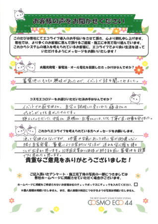 イベントでの萩生田さん、自宅に説明しに来てくれた藤永さんのプレゼンがとても良かったです。施工して頂いた、中尾さん、道端さん、白濱さんにはとても丁寧で良い印象を受けました。