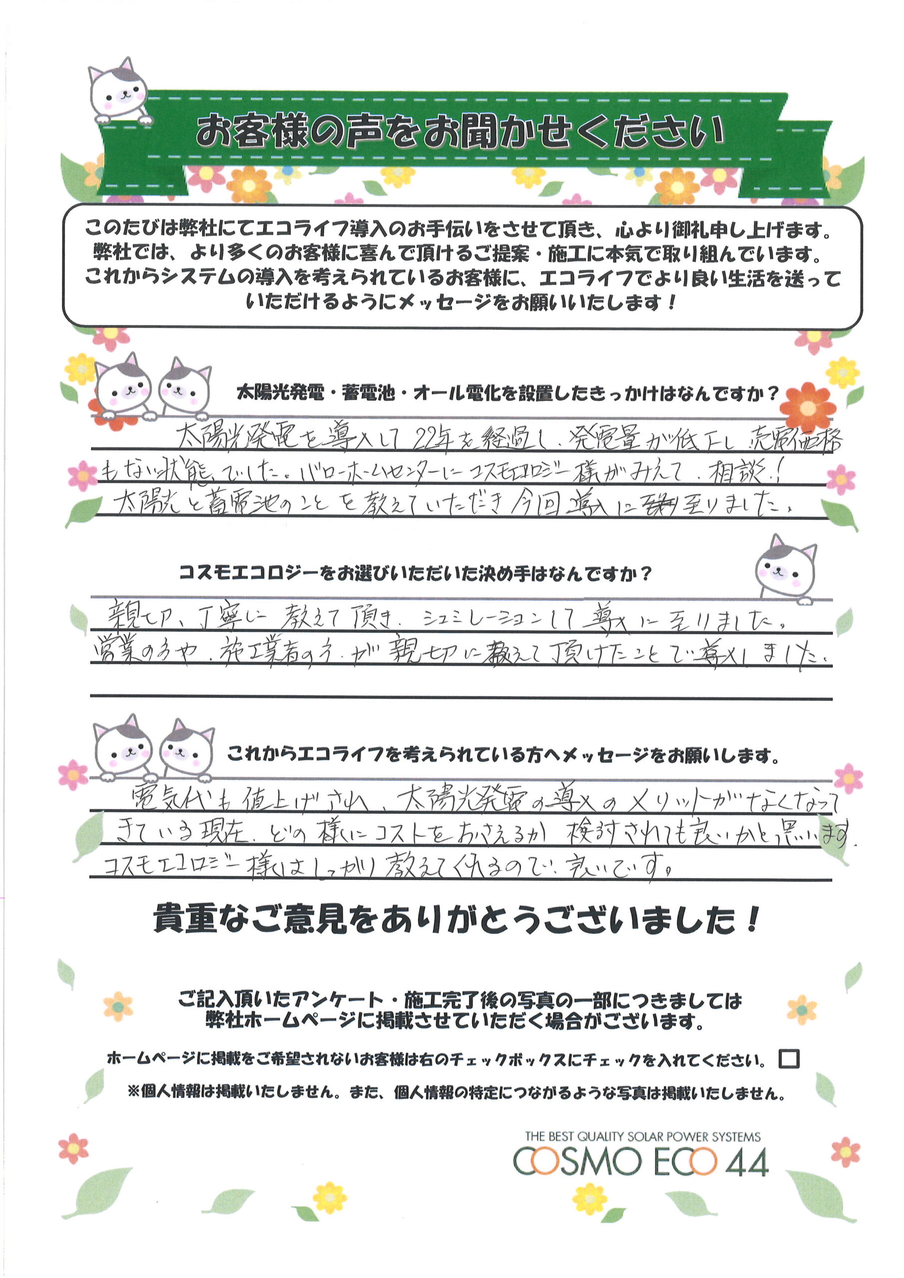 太陽光を導入して22年を経過し、発電量が低下し、売電価格もない状態でした。バローホームセンターにコスモエコロジー様がみえて、相談!太陽光と蓄電池のことを教えていただき今回導入に至りました。