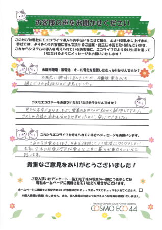 太陽光に興味はありましたが、今後電気代も値上がりの傾向なので決意しました。