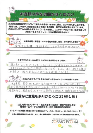 職場のショッピングセンターにイベントでよく来店しているのを見かけ、コスモエコロジーさんなら間違いないと思いました。また、担当の諸さんが親切・丁寧な対応をして頂き大変感謝しております。