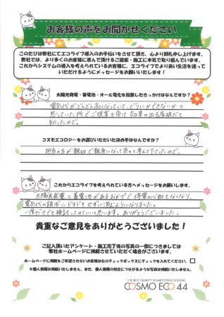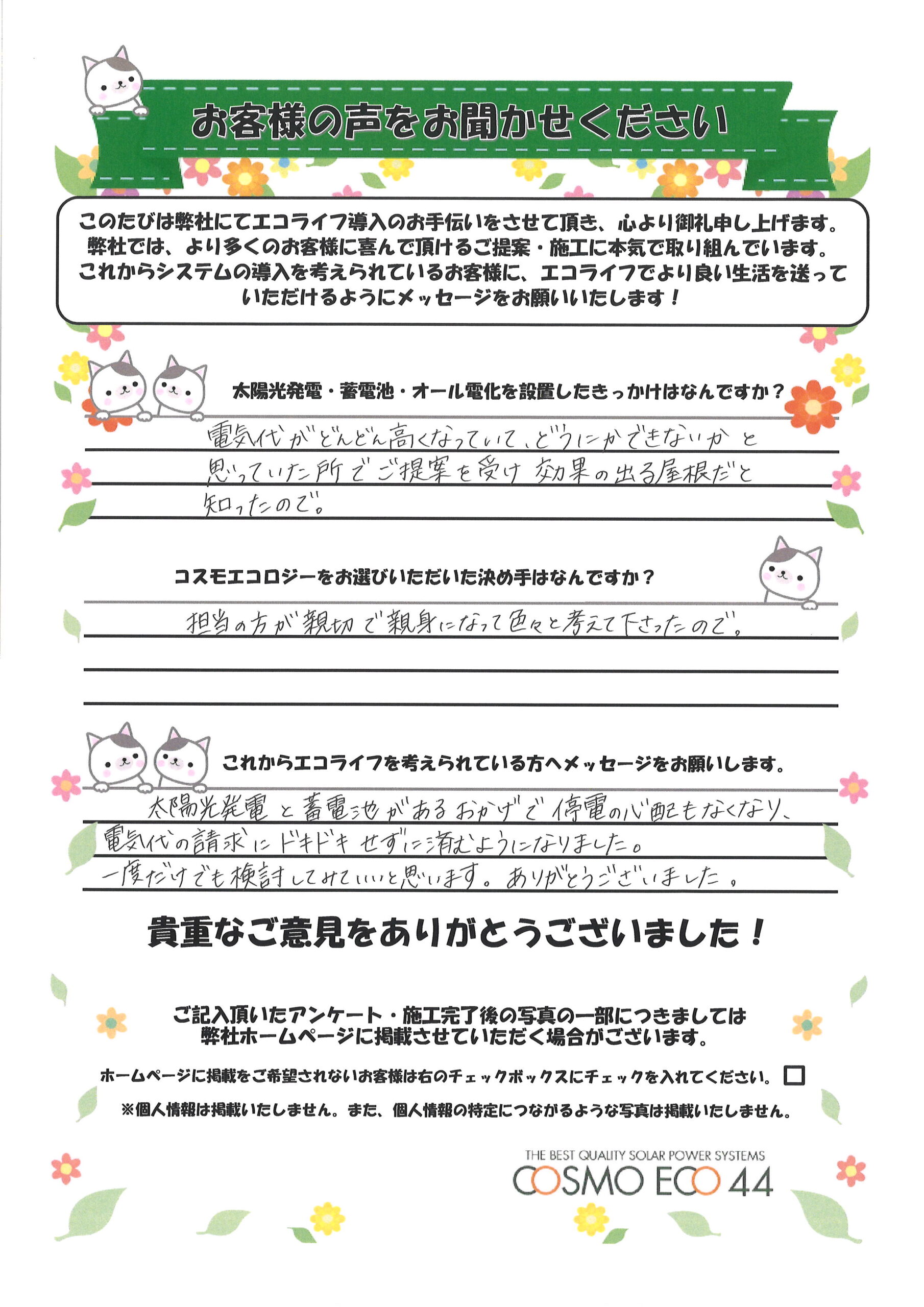 太陽光発電と蓄電池があるおかげで停電の心配もなくなり、電気代の請求にドキドキせずに済むようになりました。一度だけでも検討してみていいと思います。ありがとうございました。