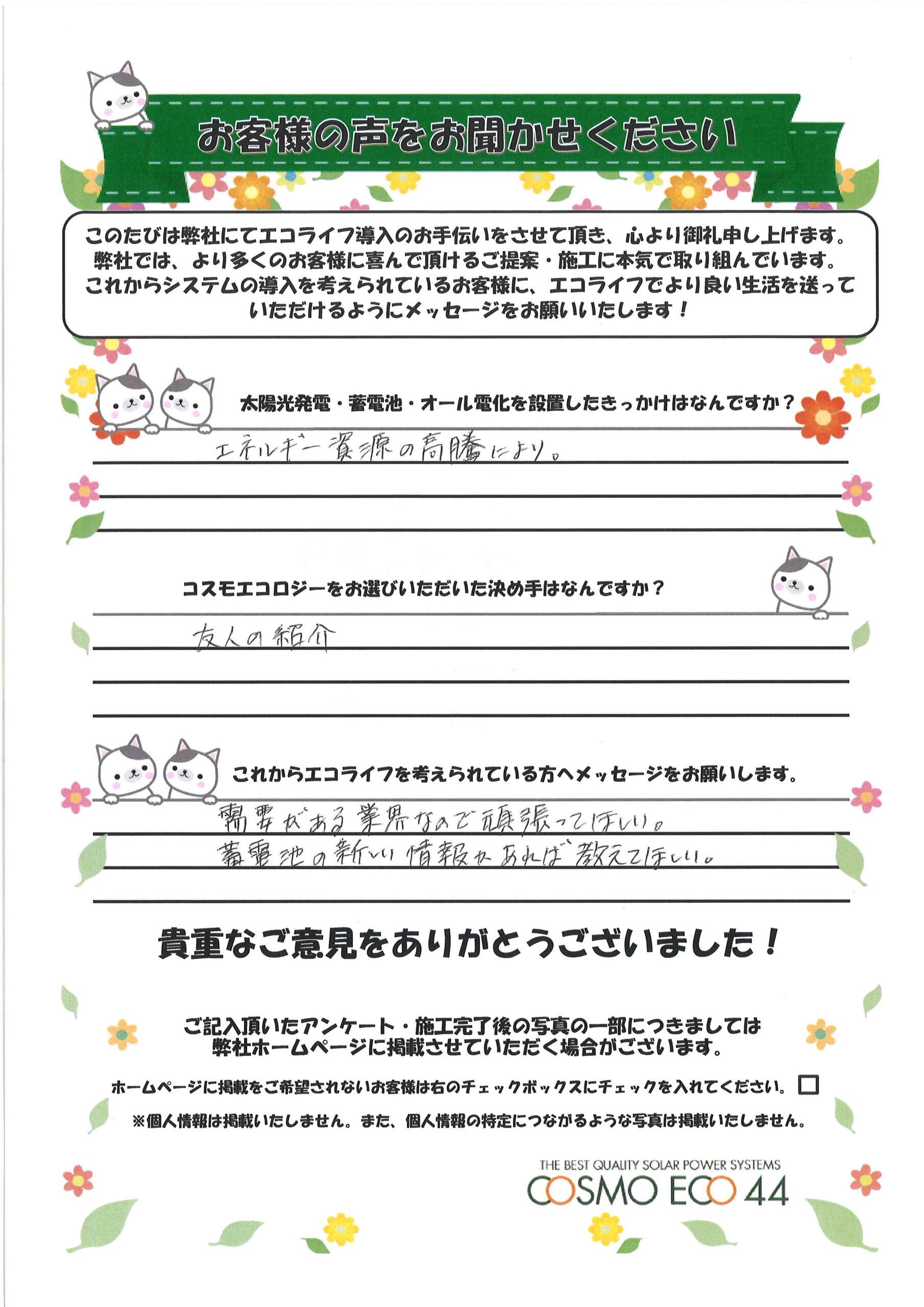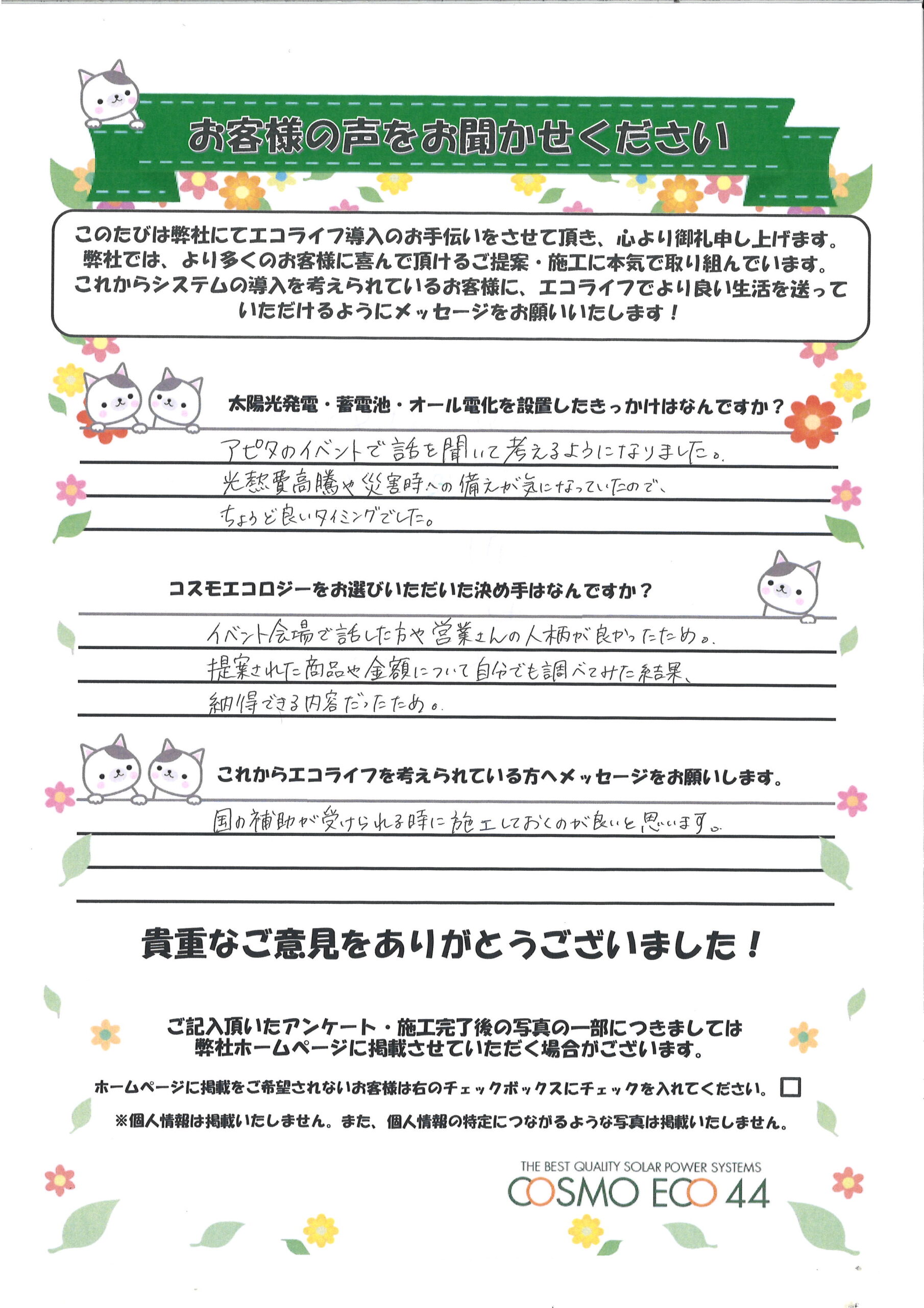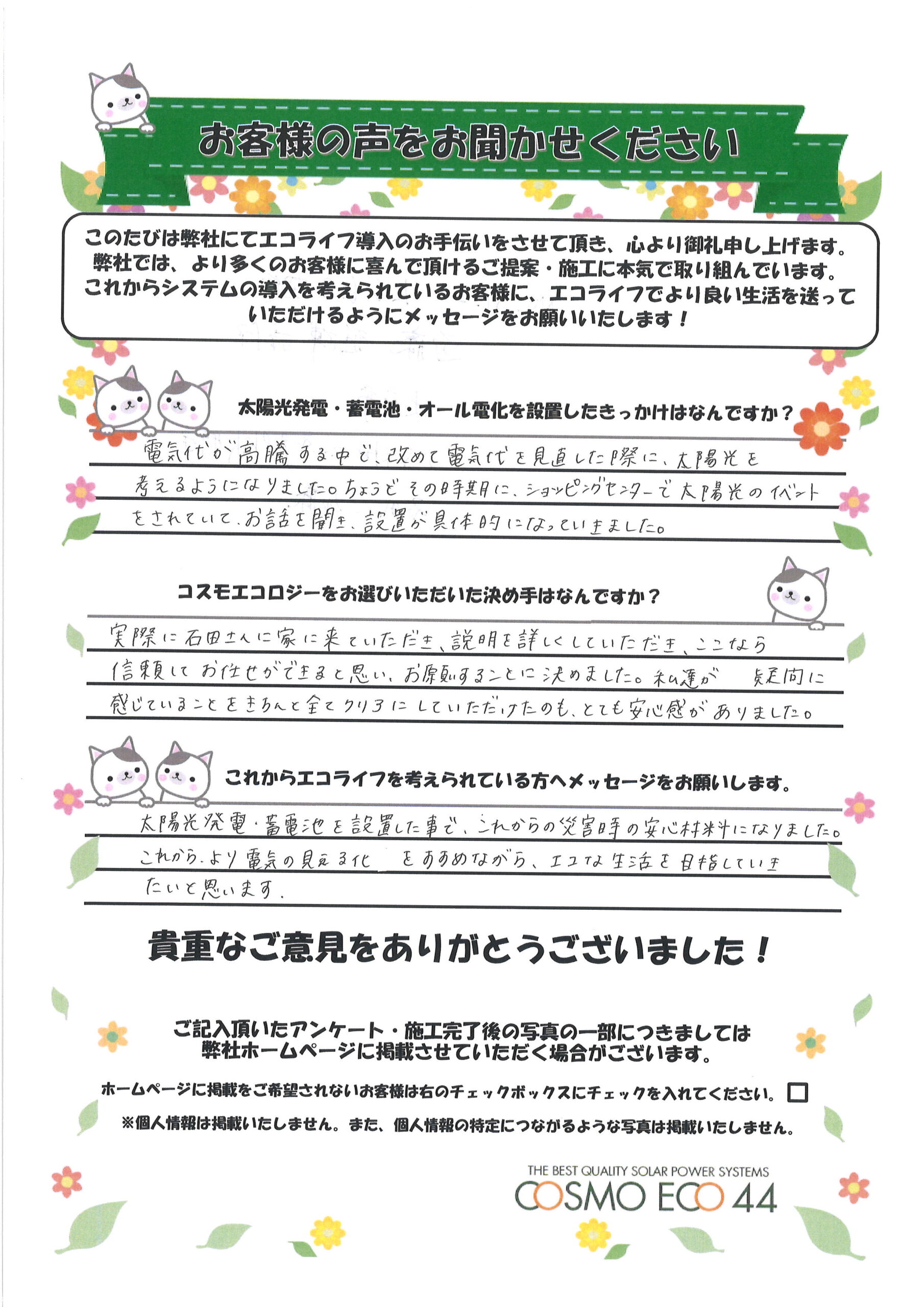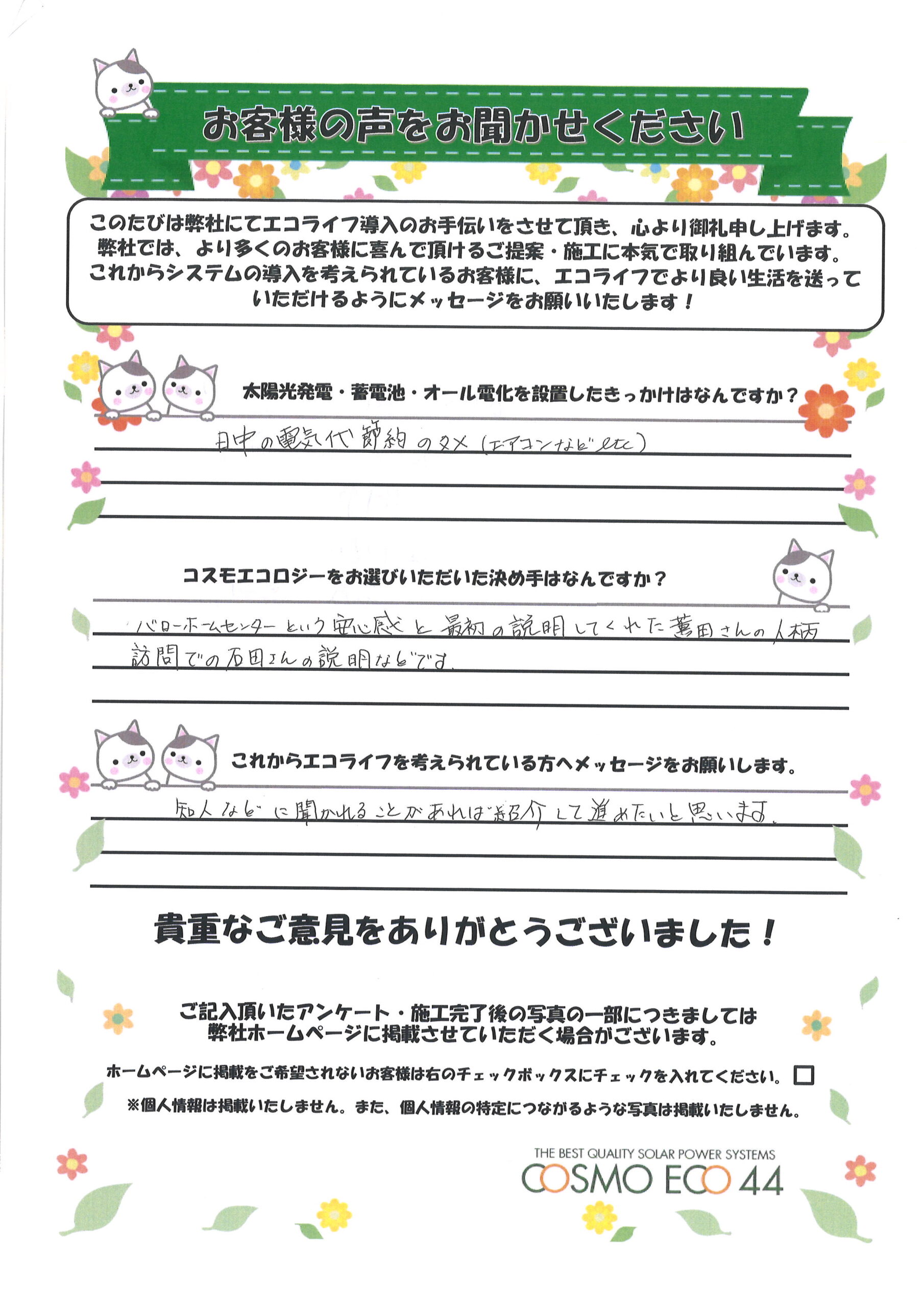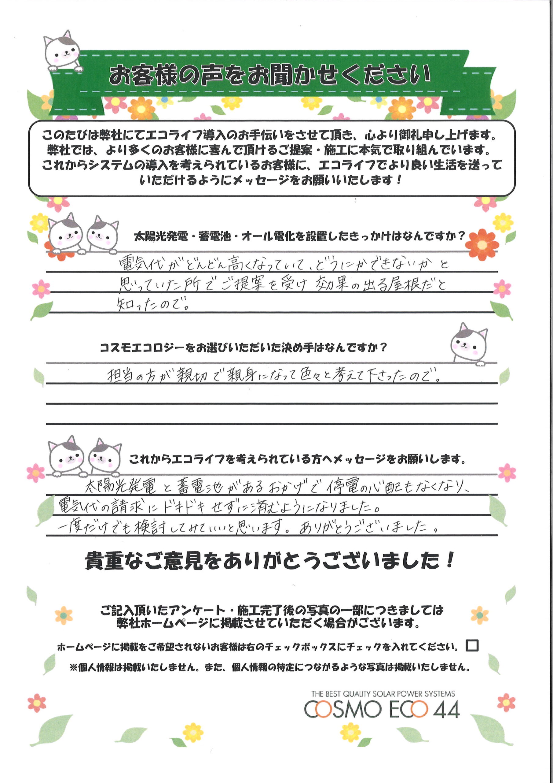 エコライフ導入のお手伝いをさせていただいた【お客様の声】を一部ご紹介させていただきます。