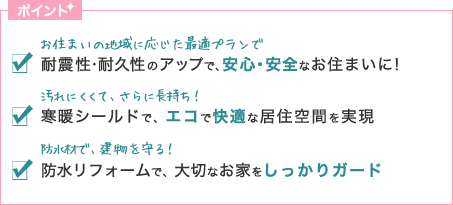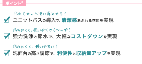 毎日の快適性を大きく左右するのがバス・トイレなどの水まわり。古くなった設備の交換だけでなく、スペースの拡張、最新設備の導入など、プラスアルファの心地良さや安全性をご提案します。